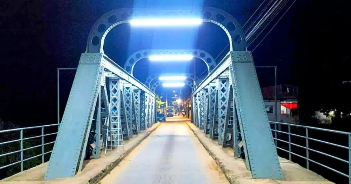 Os pilares são organizados perpendicularmente ao solo, em uma sequência ritmada, interrompida apenas pelos apoios inclinados. Essa composição aparece nas duas laterais da ponte, formando fileiras paralelas unidas por elementos em arco de cesto, vazados por círculos e losangos. Estruturada em metal de origem belga, a ponte é um testemunho da engenhosidade técnica da época. O Pontilhão de Ferro foi tombado em 8 de junho de 2000, pelo Decreto n.º 2.532/2000, e localiza-se na Rua Dr. Amilcar Alves de Souza – Bairro Santa Maria.